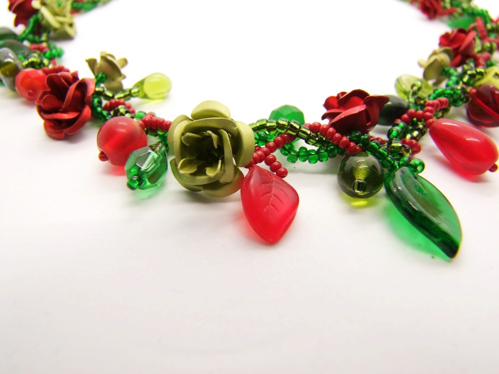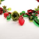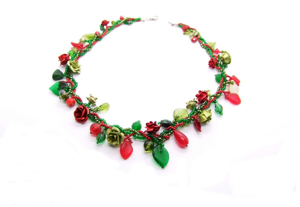 Fröhliche Kette in Rot- und Grüntönen. Verschiedene Perlen in Blatt- und Blütenform machen diese Kette so besonders.