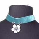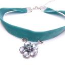 Blumenanhänger aus Glasperlen in silber/türkis. Er hängt an einem türkisen Samtband .