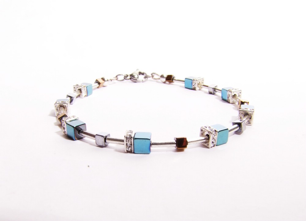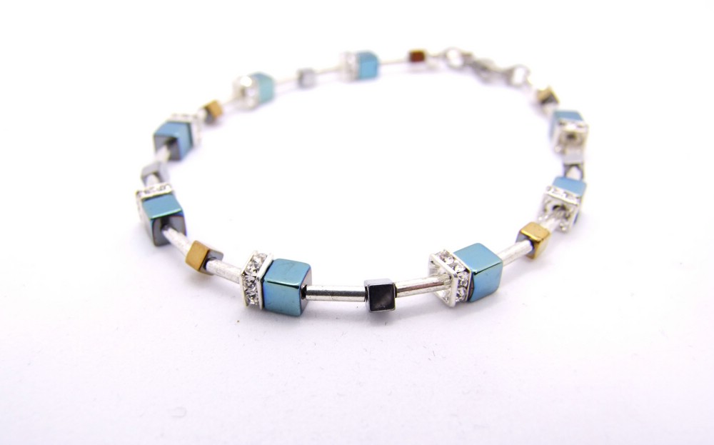 Armband aus Hämatitwürfeln und Strass auf Juwelierdraht.