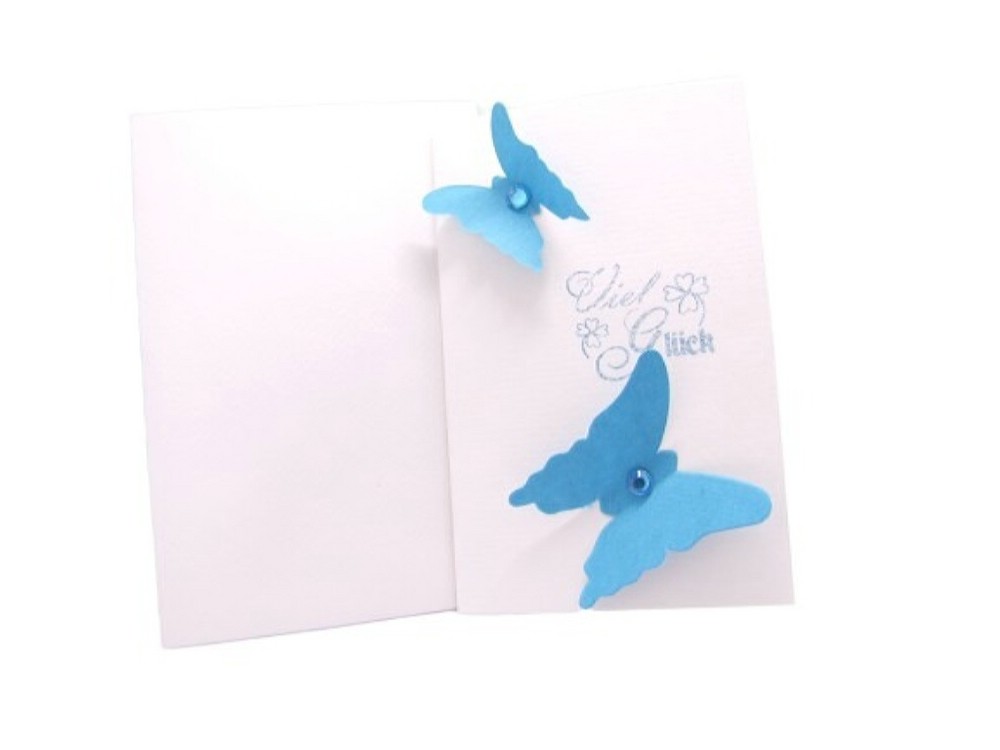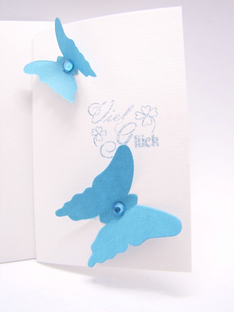 Schlichte, kleine Karte mit türkisen Schmetterlingen.