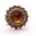 Bernsteinfarbener Glascabochon, umrahmt mit rosegoldfarbenen Swarovski®Schliffperlen und japanischen Delicaperlen in silber und rosegold. Dadurch wirkt er sehr edel.
