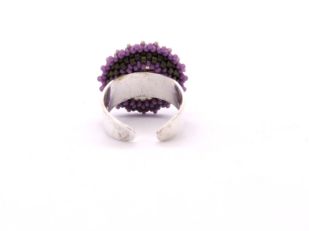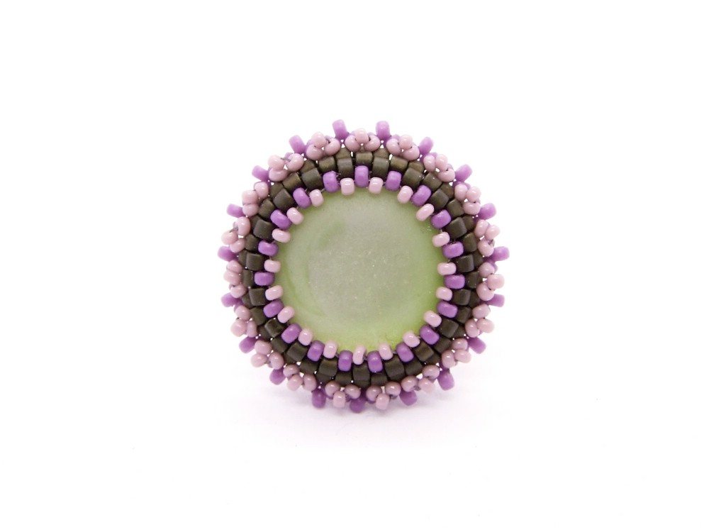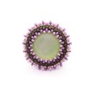 Zartgrüner Polariscabochon, umperlt mit dunkelgrünen, lila und rosa Rocailles.
