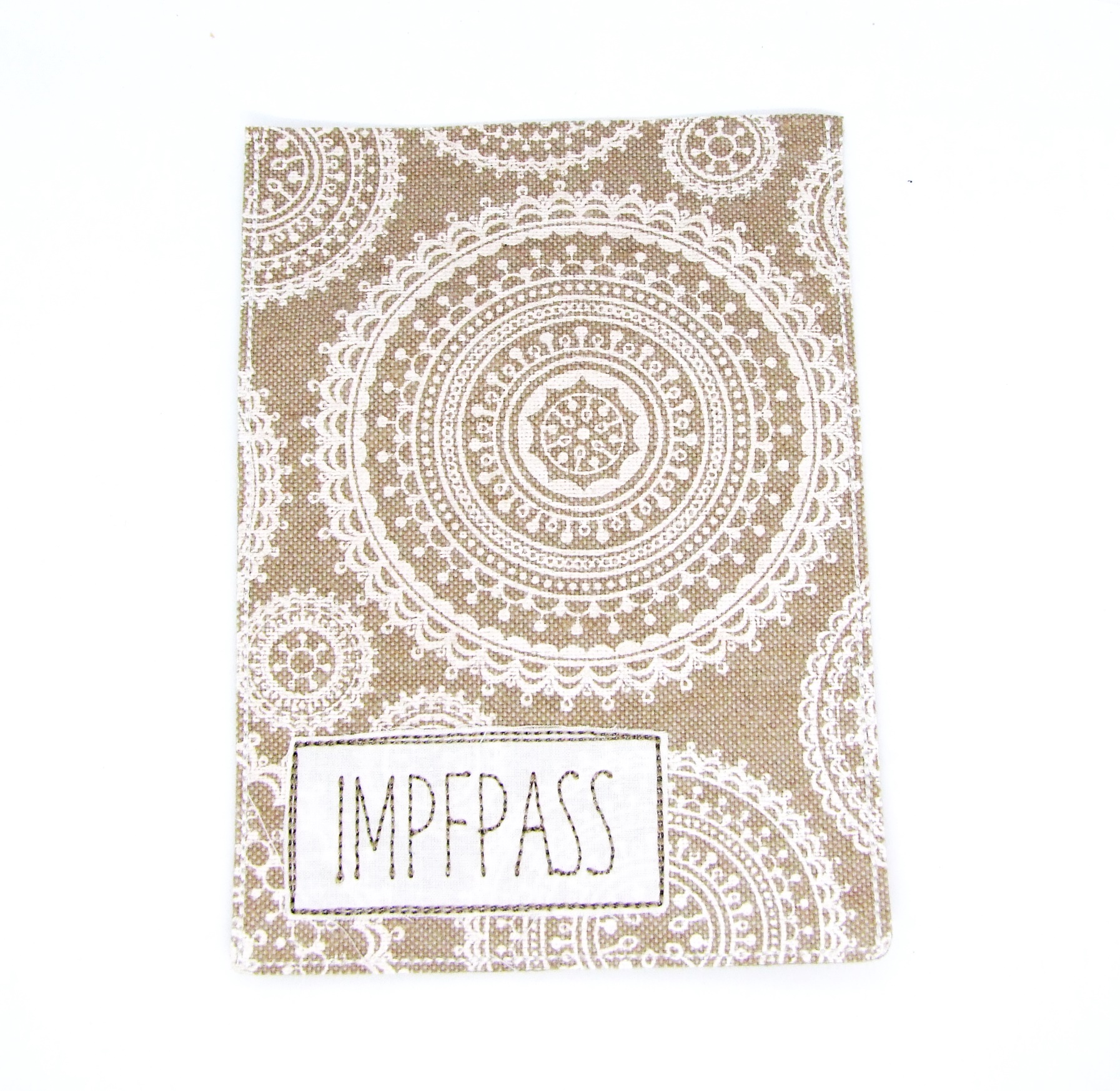 Die Impfpasshülle aus beigem Wachstuch und Stickerei